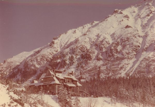 Widok na schronisko PTTK nad Morskim Okiem w scenerii zimowej. Przed schroniskiem turyści. W tle z prawej masyw Żabiej Czuby.