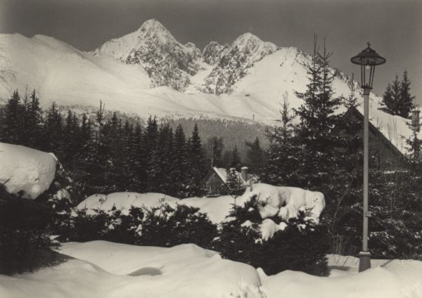 VYSOKÉ TATRY - HOHE TATRA - THE HIGH TATRAS. Tatranská Lomnica (850 m). Poh”ad na Lomnickę čtít (2632 m) a KeŸmarskę čtít (2558 m).