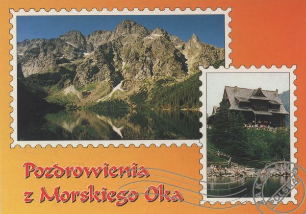 Schronisko nad Morskim Okiem. Na dole po lewej stronie napis: Pozdrowienia z Morskiego Oka. Po prawej nadrukowany stempel pocztowy: ZAKOPANE, POLSKA.