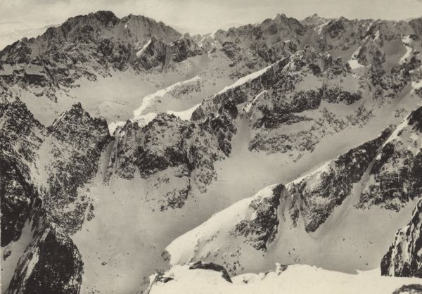 VYSOKÉ TATRY - Pohľad s Lomnického štítu 2634 m. Stalinov štít 2663 m. Vysoká 2565 m. Kriváň 2496 m. Veľka studená dolina. Prostredný hrebeň. Malá studená dolina
