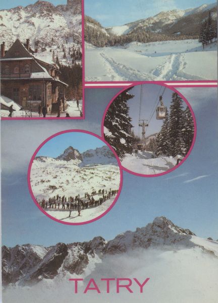 Pocztówka 5. elementowa. Na kolejnych zdjęciach przedstawiono w zimowej scenerii: Schronisko PTTK im. Stanisława Staszica nad Morskim Okiem