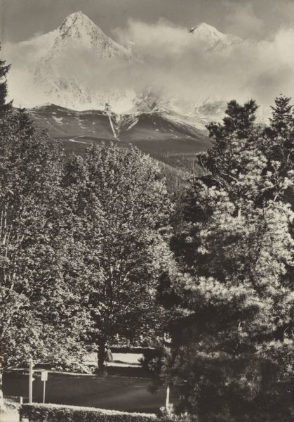 Vysoké Tatry - Tatr. Lomnica. Poh”ad na park a na zasneŸenę Lomnickę čtít 2634 m a KeŸmarskę čtít 2556 m v lete.
