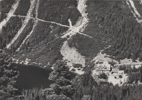 Widok na Morskie Oko, nad jego brzegiem schronisko PTTK. Na pierwszym planie limby (pinus cembra L.) i świerki (Picea A. Dietr.).
