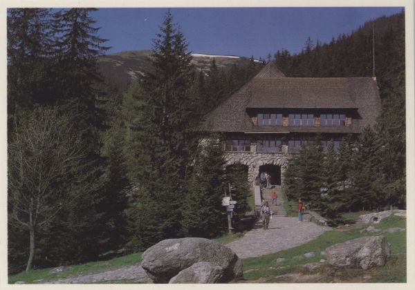 Widok na Schronisko na Polanie Chochołowskiej otoczone lasem. Przed schroniskiem turyści.