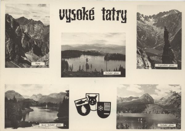 Widok na Szczyrbskie Jezioro, w tle Szczyrbskie Solisko. W górnej części pocztówki napis: vysoké tatry, a w dolnej herby 3 miejscowości.
