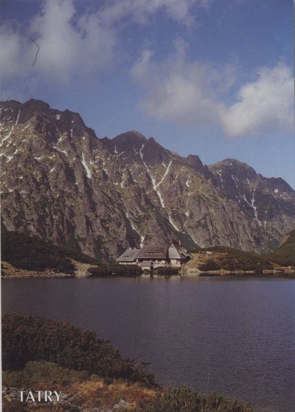 Na pierwszym planie tafla Przedniego Stawu w głębi budynek schroniska w Dolinie Pięciu Stawów Polskich. W tle Wielki Wołoszyn, Pośredni Wołoszyn i Skrajny Wołoszyn. Napis: TATRY.