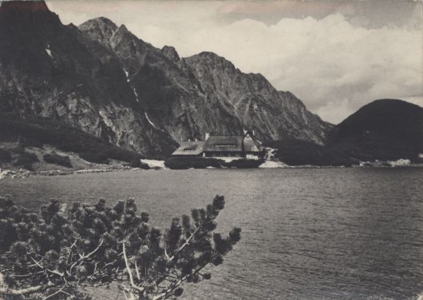 Na pierwszym planie gałąź kosodrzewiny, za nią Przedni Staw, a w głębi schronisko w Dolinie Pięciu Stawów Polskich. Po prawej stronie Niżnia Kopa. Po lewej Pośredni i Skrajny Wołoszyn.