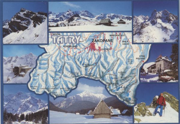 Pocztówka 9. elementowa zimowa. Po ¶rodku pocztówki zamieszczona mapka Tatr Polskich z okolicznymi miejscowo¶ciami. Po lewej stronie u góry Ko¶cielec obok Hala G±sienicowa z szałasami w tle Ko¶cielec, ¦winica. Obok widok ze Szpiglasowego Szczytu na Rysy, Mięguszowieckie Szczyty i Cubrynę. Poniżej schronisko Murowaniec na Hali G±sienicowej. Poniżej turysta na grani Małego Koziego Wierchu. Obok po lewej stronie widok na Kominiarski Wierch z Polany Chochołowskiej. Obok Mięguszowieckie Szczyty. Powyżej górna stacji kolejki linowej na Kasprowy Wierch.