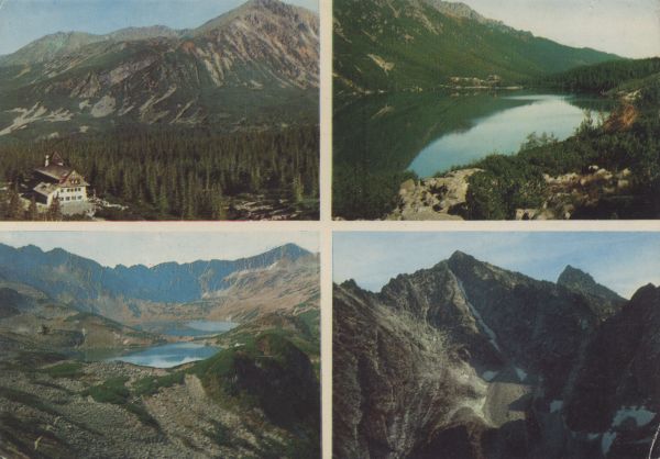 Pocztówka 4. elementowa. Po lewej stronie u góry schronisko Murowaniec na Hali G±sienicowej w tle po prawej Żółta Turnia. Obok Morskie Oko. Poniżej widok na Rysy. Obok Dolina Pięciu Stawów Polskich w tle Kotelnica, Szpiglasowy Wierch.