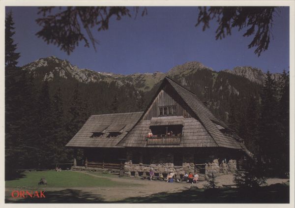 Schronisko na Hali Ornak. Przed schroniskiem turyści. W tle Raptawicka Grań. W dolnym lewym rogu napis ORNAK.