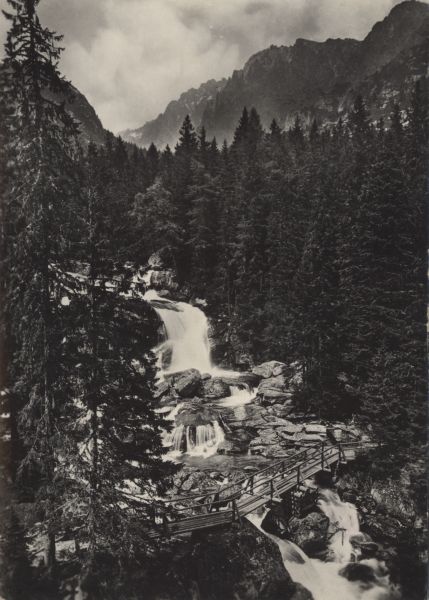 Wodospady Zimnej Wody w Dolinie Małej Zimnej Wody. W tle Rywociny i masyw Łomnicy. Na pierwszym planie mostek. Po obu stronach wodospadu las.