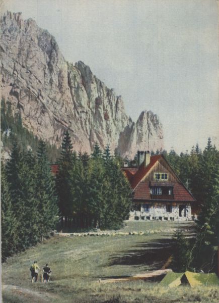 Schronisko na Hali Ornak w Dolinie Kościeliskiej W tle Raptawicka Grań. Na pierwszym planie w prawym dolnym roku dwa rozbite namioty i dwaj turyści.