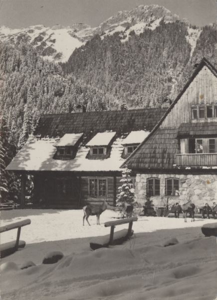 Schronisko na Hali Ornak przysypane śniegiem. W tle Raptawicka Grań. Przed schroniskiem jelenie (Cervus elaphus) i turyści.