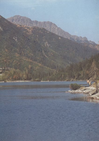 TATRY WYSOKIE. Morskie Oko (1393 m) największe jezioro w Tatrach (pow. 34,54 ha, głęb. 50,80 m), w głębi Mięguszowieckie Szczyty.