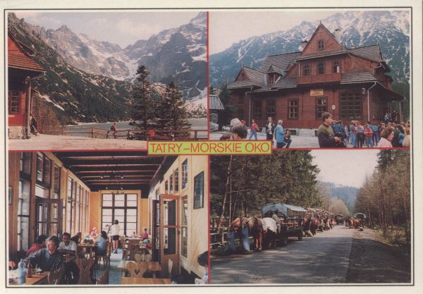Pocztówka 4. elementowa. Po lewej u góry fragment schroniska oraz widok na Niżne Rysy i Rysy. Obok widok na schronisko im. St Staszica, duża grupa turystów przed schroniskiem. U dołu po lewej wnętrze schroniska z turystami. Obok kolejka wozów konnych jeżdżących drogą do Morskiego Oka. Napis TATRY - MORSKIE OKO.