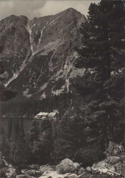 Poprzez drzewa widok na Popradzki Staw i schronisko nad Popradzkim Stawem. W tle Pośrednia Baszta.