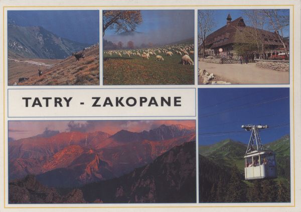 Pocztówka 5 elementowa. U góry po lewej stronie dwie kozice (rupicapra rupicapra) na stoku. Obok kierdel owiec na polanie, obok Dom Turysty w Zakopanem przy ul. Zaruskiego. Poniżej wagonik kolei linowej na Kasprowy Wierch. Obok pejzaż tatrzański z Sarniej Skały, widać Kopę Magury, Żółtą Turnię, Granaty. Napis: TATRY-ZAKOPANE.