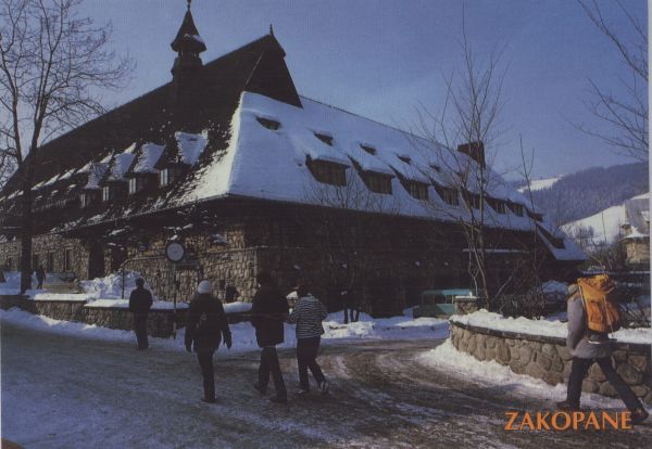 Dom turysty w Zakopanem przy ul. M. Zaruskiego w zimowej scenerii. Przed budynkiem kilkoro turystów.