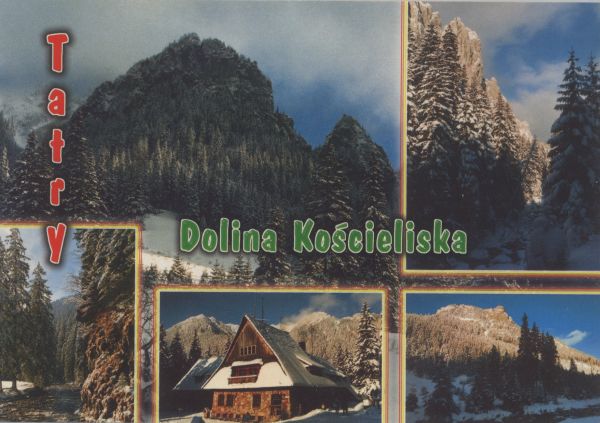 Pocztówka 5. elementowa. Na zdjęciu po lewej stronie widok na Saturn, obok na zdjęciu Raptawicka Turnia. Poniżej Stoły, obok schronisko na Hali Ornak, obok Brama Kantaka u wylotu Doliny Kościeliskiej. Napisy: Tatry, Dolina Kościeliska.