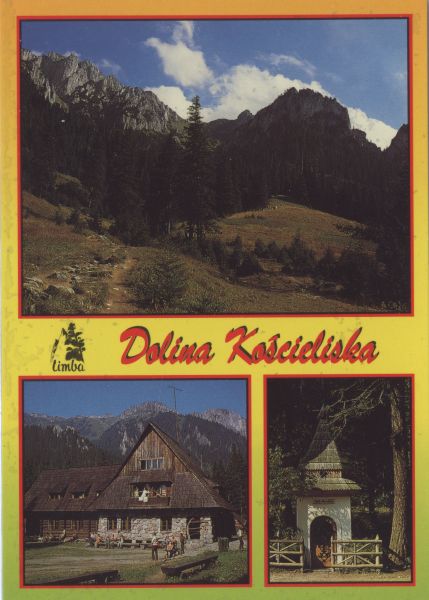 Pocztówka 3. elementowa. Na zdjęciu u góry Polana Pisana, poniżej po lewej schronisko na Hali Ornak, obok Kapliczka Zbójnicka przy szlaku w Dolinie Kościeliskiej. Logo wydawcy i napis: Dolina Kościeliska.