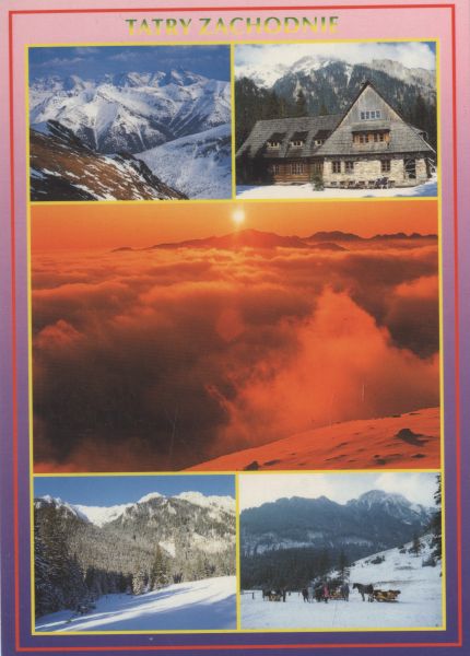 Pocztówka 5. elementowa. Po lewej u góry pejzaż Tatr Zachodnich, ośnieżone szczyty. Obok schronisko na Hali Ornak w Dolinie Kościeliskiej. Poniżej panorama Tatr w morzu chmur. Poniżej po lewej stronie Polana Pisana. Obok sanie zaprzężone w konie na Hali Pisanej w tle Kominiarski Wierch. Napis: TATRY ZACHODNIE.