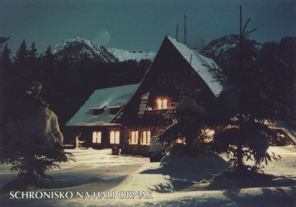 Budynek schroniska na Hali Ornak nocą w zimowej scenerii. W oknach pali się światło. Przed schroniskiem świerki. Napis: SCHRONISKO NA HALI ORNAK.