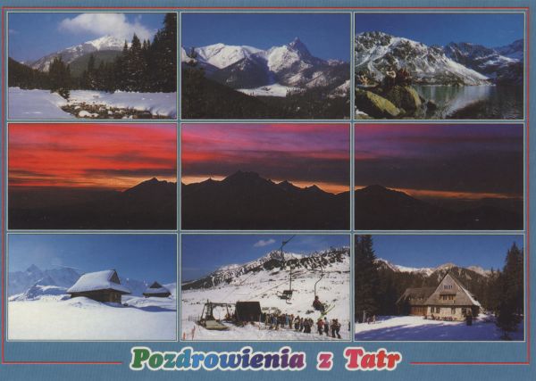 Pocztówka 9. elementowa, zimowa. Na górze po lewej stronie widok na Kominiarski Wierch. Obok Giewont i Czerwone Wierchy. Obok Czarny Staw G±sienicowy. Poniżej w trzech czę¶ciach panorama Tatr o zachodzie słońca. Poniżej po lewej Hala G±sienicowa z szałasami w tle po lewej widać Ko¶cielec. Obok narciarze przy stacji kolei linowej krzesełkowej na Kasprowy Wierch w Kotle G±sienicowym. Obok schronisko na Hali Ornak w Dolinie Ko¶cieliskiej. Napis: Pozdrowienia z Tatr.