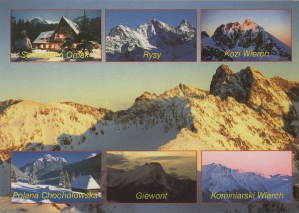 Pocztówka 7. elementowa, zimowa. Po lewej stronie u góry schronisko na Hali Ornak nocą z rozświetlonymi oknami. Obok widok na Rysy. Obok Kozi Wierch. Poniżej tatrzański pejzaż- Tatry Wysokie: Miedziane, Szpiglasowy Wierch, Mięguszowiecki Szczyt, Rysy. Poniżej szałas na Polanie Chochołowskiej. Obok Giewont od południowo-wschodniej strony. Obok Kominiarski Wierch. Zdjęcia podpisane.