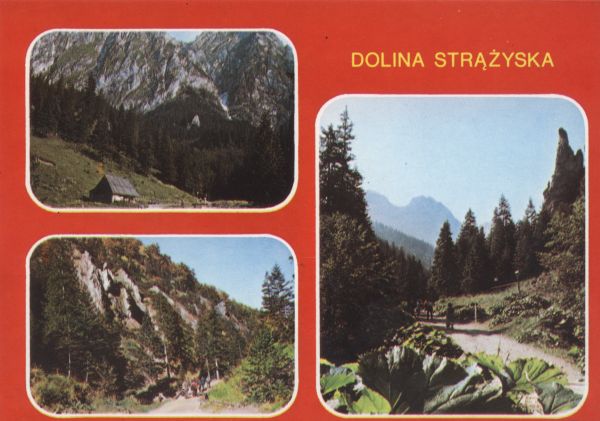 Zestaw trzech zdjęć umieszczonych obok napisu DOLINA STRĄŻYSKA: Polana Strążyska z szałasem i północnymi ścianami Giewontu