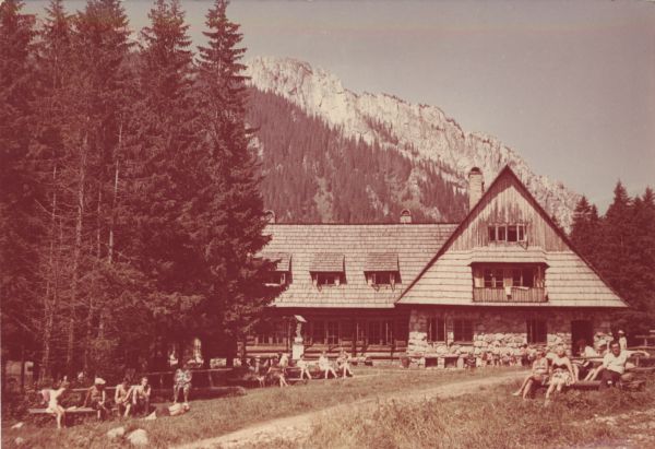 Budynek schroniska na Hali Ornak. Przed schroniskiem turyści opalający się na ławeczkach. W tle Raptawicka Grań.