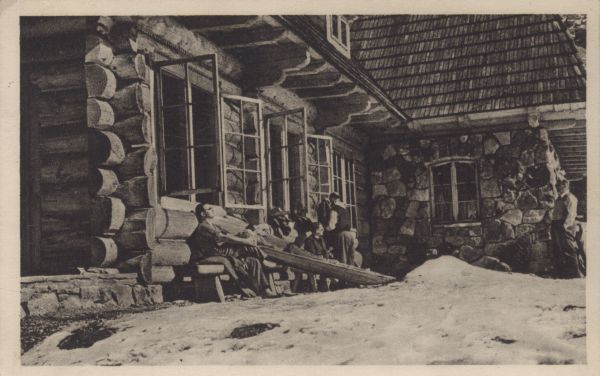 Turyści opalający się przed schroniskiem na Hali Ornak w zimie.