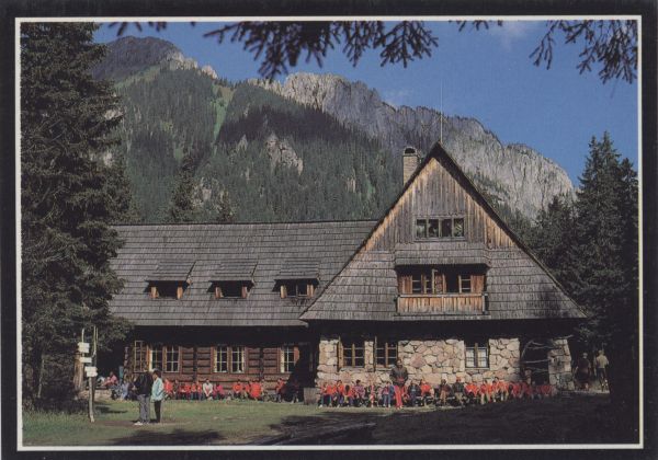 Schronisko na Hali Ornak. Przed schroniskiem duża grupa turystów. W tle Raptawicka Grań.