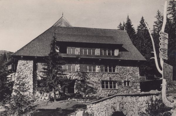 Schronisko na Polanie Chochołowskiej. Po prawej stronie drogowskaz.