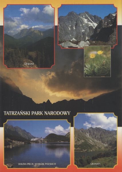 Pocztówka 6. elementowa. Po lewej stronie u góry widok na Giewont. Obok widok na Rysy. Poniżej panorama Tatr o zachodzie słońca. Poniżej po lewej stronie Dolina Pięciu Stawów Polskich w tle schronisko nad Przednim Stawem. Obok widok na Granaty znad Czarnego Stawu Gąsienicowego. W środkowej części omieg kozłowiec (doronicum clusii). Napis: TATRZAŃSKI PARK NARODOWY. Zdjęcia podpisane.