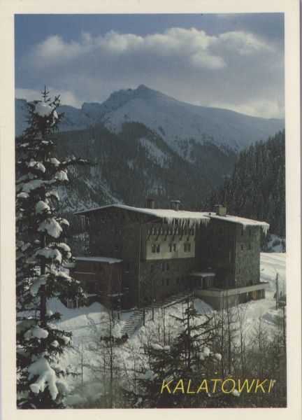 Schronisko na Polanie Kalatówki - Hotel Górski w zimowej scenerii. W tle Kasprowy Wierch. Napis: KALATÓWKI.