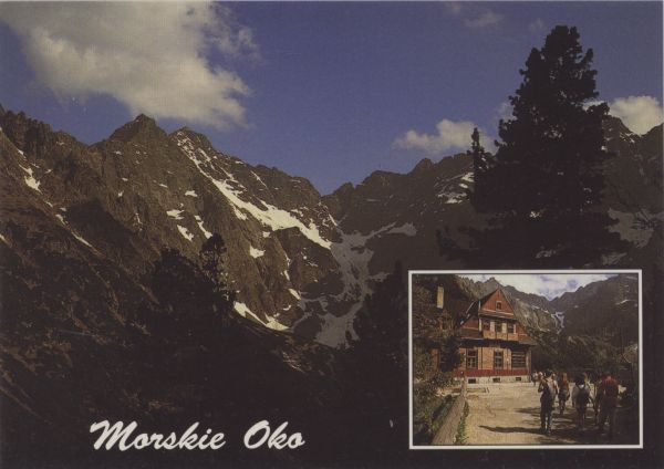 Pocztówka 2. elementowa. Na głównym zdjęciu widok znad Morskiego Oka. Po lewej stronie Niżnie Rysy i Rysy. Na małym zdjęciu turyści przed schroniskiem nad Morskim Okiem. Napis: Morskie Oko.