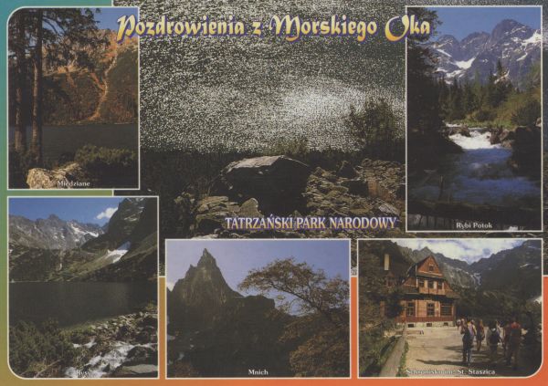 Pocztówka 6. elementowa. U góry po lewej stronie Miedziane nad Morskim Okiem. Obok tafla Morskiego Oka. Obok Rybi Potok w tle Mięguszowieckie Szczyty. Poniżej schronisko im. St. Staszica nad Morskim Okiem, przed schroniskiem turyści. Obok widok na Mnicha. Obok Rysy wznoszące się nad Morskim Okiem. Napisy: Pozdrowienia z Morskiego Oka. TATRZAŃSKI PARK NARODOWY. Zdjęcia podpisane.