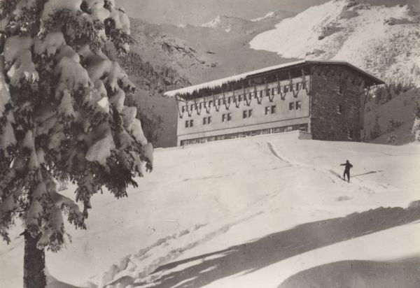 Schronisko - Hotel Górski na Polanie Kalatówki w zimowej scenerii. W tle Suchy Żleb. Przed schroniskiem narciarz.
