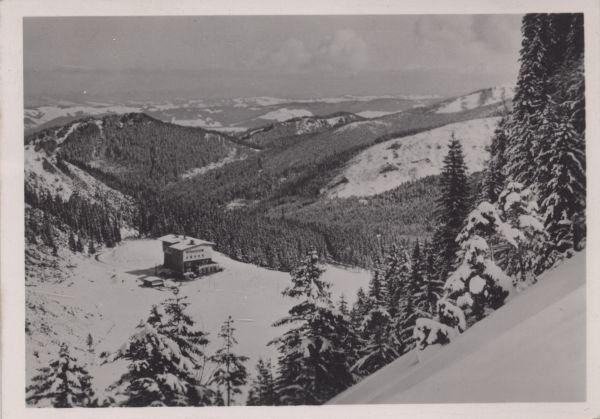 Widok na Polanę Kalatówki zimą. W głębi widać schronisko - Hotel Górski.