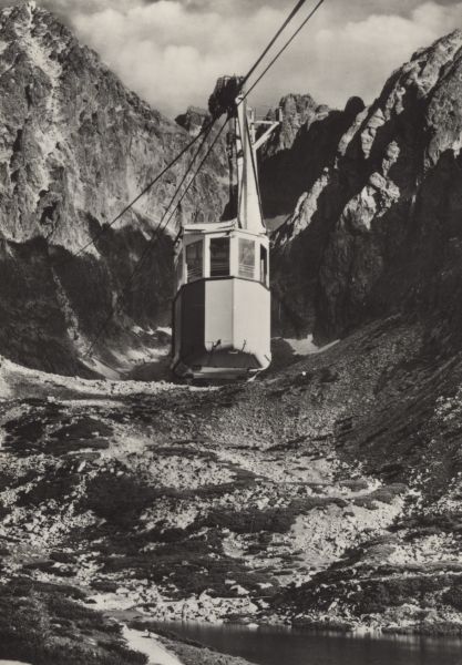 Wagonik kolei linowej nad Dolin± Łomnick±. W dole Łomnicki Staw. W tle Łomnica i Kieżmarski Szczyt.