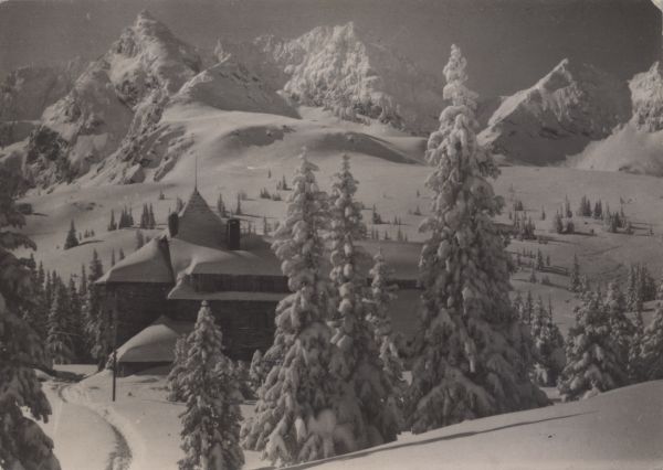 Hala Gąsienicowa zimą. W głębi schronisko Murowaniec. W tle Kościelec i Świnica.