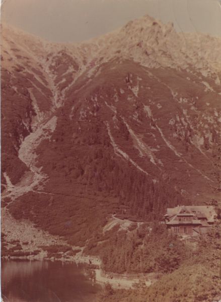 Widok na Morskie Oko. Po lewej stronie w rogu tafla Morskiego Oka po prawej w głębi budynek schroniska. W tle widać Opalony Wierch i Marchwiczną Przełęcz.