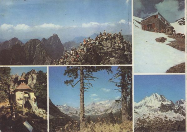 Pocztówka 5. elementowa. U góry po lewej panorama Tatr Wysokich. W prawym rogu turyści na szczycie Rysów. Obok u góry budynek schroniska pod Rysami, przed schroniskiem turyści. U dołu po lewej kapliczka na tatrzańskim cmentarzu symbolicznym, w tle Osterwa. Obok panorama Tatr Wysokich. Obok grupa Wysokiej.