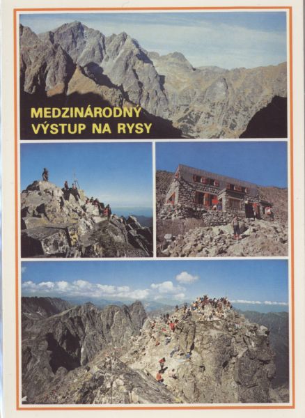 Pocztówka 4. elementowa. Na zdjęciu u góry widok na Rysy. Poniżej po lewej stronie turyści na szczycie Rysów. Obok schronisko pod Rysami. Poniżej szczyt Rysów na nim turyści w tle Koprowy Wierch i Mięguszowieckie Szczyty. Napis: MEDZINÁRODNÝ VÝSTUP NA RYSY.