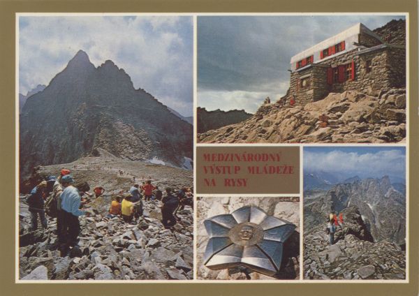 Pocztówka 5. elementowa. Na zdjęciu po lewej stronie turyści na szlaku na Rysy, w tle widać Wagę, Wysoką, Ciężki Szczyt. Obok u góry schronisko pod Rysami. Poniżej pamiątkowa tablica W.I. Lenina. Obok turyści na szczycie Rysów. Napis: MIEDZINÁRODNÝ VÝSTUP MLÁDEŽE NA RYSY.