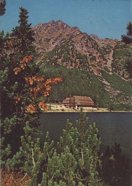 TATRY WYSOKIE. Popradzki Staw w środkowej części Doliny Mięguszowieckiej ze schroniskiem kpt. Morávku na jego południowym brzegu. Tytuł również w języku: niem., ang., fr.