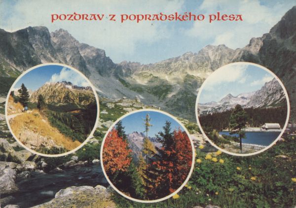 Pocztówka 4. elementowa: Dolina Mięguszowiecka, w tle Szatan i Hlińska Turnia. Magistrala Tatrzańska, w tle Popradzka Kopa i Wysoka. Widok na Wysoką. Hotel górski kpt. Morávku nad Popradzkim Stawem. Napis: pozdrav z popradského plesa.