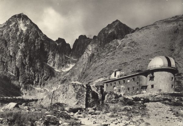 Dolina Łomnicka. Budynek obserwatorium astronomicznego nad Łomnickim Stawem. W tle Łomnica, Widły i Kieżmarski Szczyt.
