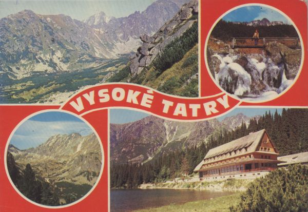 Pocztówka 4. elementowa: Dolina Furkotna, w tle Krywań. Żabi Potok w Dolinie Mięguszowieckej. Widok do Doliny Młynickiej. Hotel górski nad Popradzkim Stawem. Napis: Vysoké Tatry.