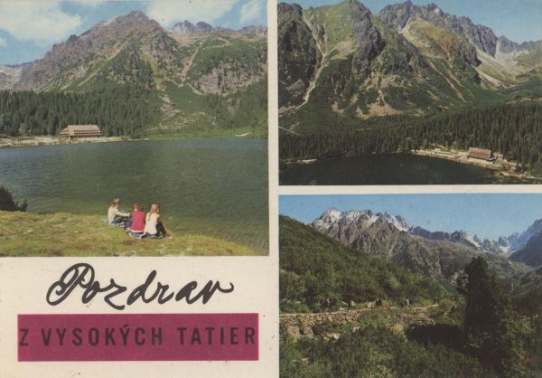 Pocztówka 3. elementowa: Hotel górski nad Popradzkim Stawem wraz z otoczeniem. Magistrala Tatrzańska, w tle Wysoka. Napis: Pozdrav z Vysokých Tatier.